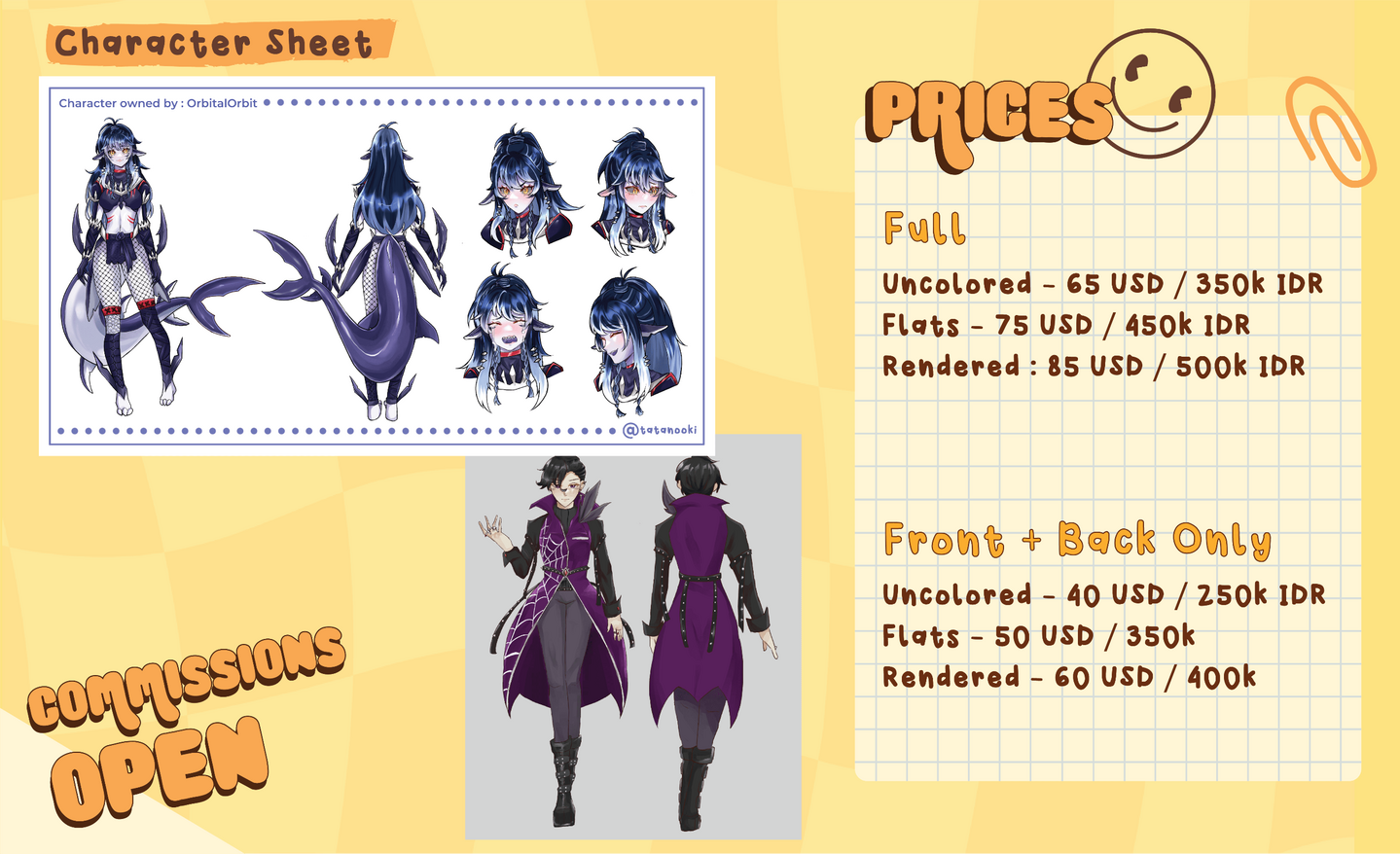 DURATION : Character Art takes 1-2 weeks, Character Sheet takes 2-3 weeks depending on design complexity. Full Illustration can take from 2 weeks to 2 months. I’m not available ALL the time but I try to be easy to contact. I do not accept rush commissions for now.